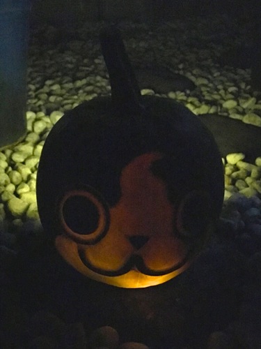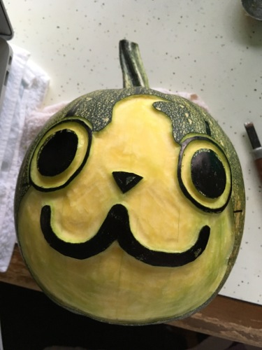 次はジバニャン…というかかぼちゃを彫っているのでカボチャニャン?私のパンプキンカービングの手法は「マジックで下描きを描いてその通りに彫刻刀で彫る」というものなんですが、何気に妖怪ウォッチのキャラクターは描くのが難しいです。目、鼻、口の顔パーツが全て離れているキャラが多く、そのバランスを見極めるのが大変です。ちょっとでも狂うと途端にブサイクになってしまいます。