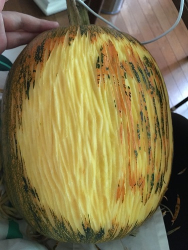 最後の大きいカボチャにはちょっと新機軸なカービングを施しました。まず全面を彫刻刀の”角”で粗めに彫ります。