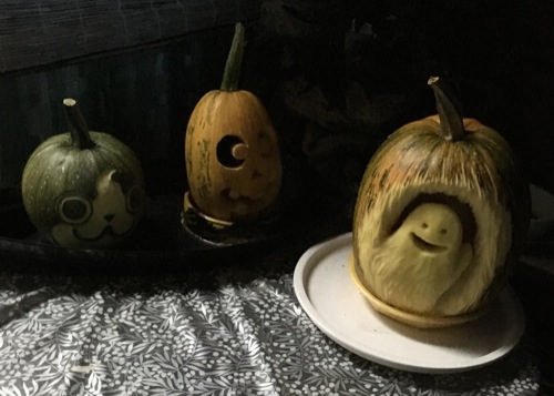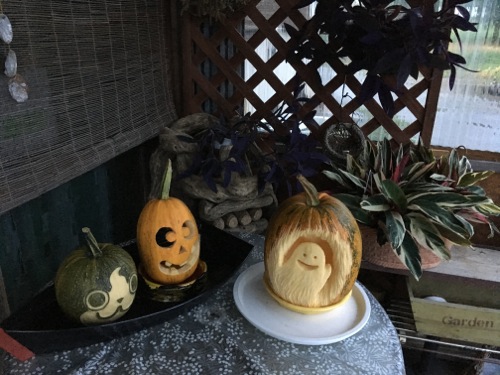 これらのパンプキンカービングは、高温多湿な日本では彫った次の日あたりからカビが生えたり部分的に腐ってきたりと全然長持ちしません。なのでこれらも次週を超えられるかどうかはかなり怪しいです。まあ腐り果てるまで庭に飾ったり素材用の写真を撮影しますけどね。腐って形が無くなる最後の最後まで役に立ってもらいます。
