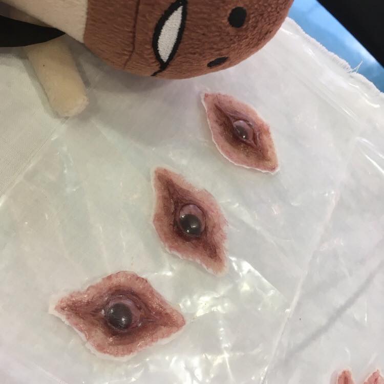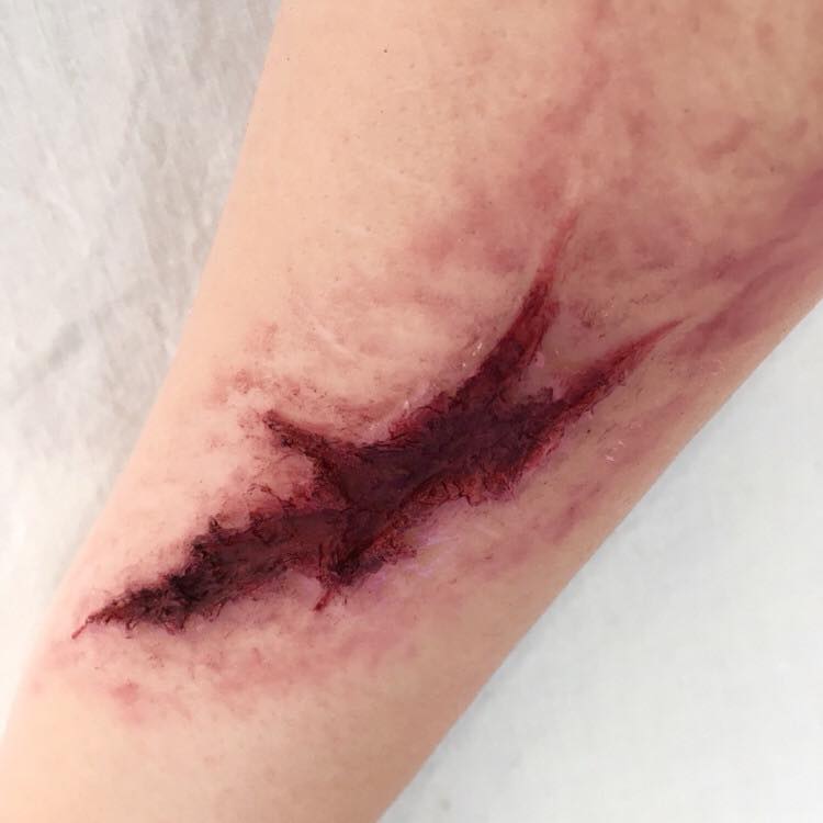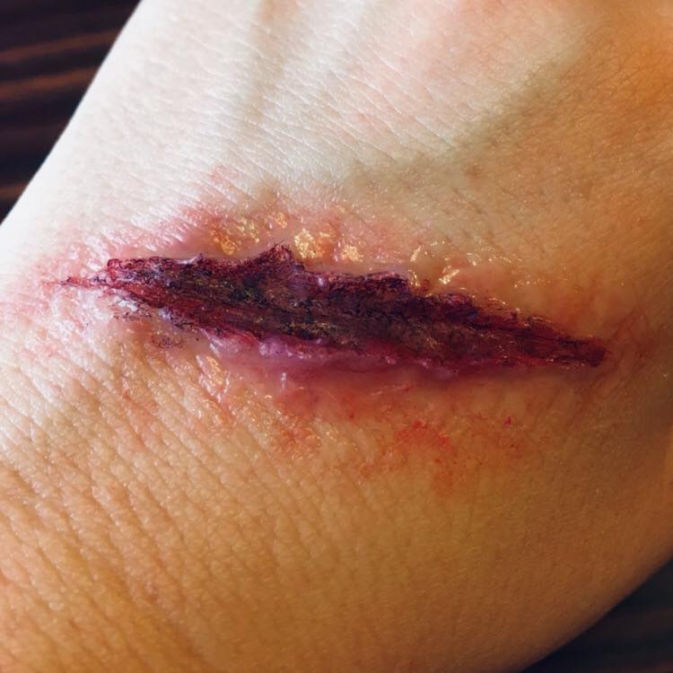 自分の手に見本としてやった傷メイク。今回の私の役割は、スタッフの青年部の人々にメイクしたり、パーティ開始後に参加者の方々にメイクするというもの。普段はイベント会場に特殊メイクブースを出展し、一人1回500円とか都度料金を頂くのですが、今回はメイク体験も参加費に含まれているという設定のため、何回でも無料でできて、帰るときにメイク落としまで私がやるというシステムにさせて頂きました。