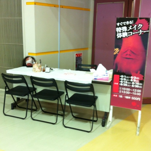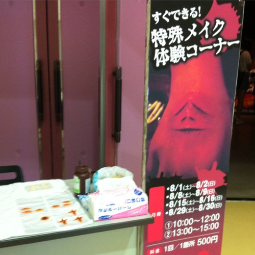 本日のお客さんの総人数はこれまでの最多で35人!これにて特殊メイク体験コーナーの累計来場者数が100人を突破しました。来て下さった皆様どうもありがとうございました。メイクの写真は是非TwitterやFacebookやInstagramやLINEなどのソーシャルメディアで共有して下さい。次回は8月15日(土)と16日(日)で、時間は変わらず10:00〜12:00、13:00〜15:00です。