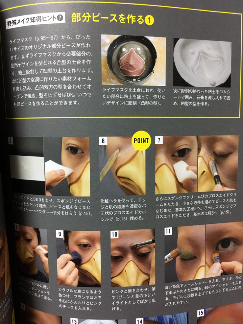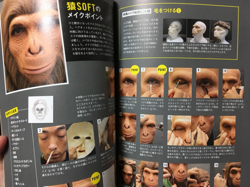 この精巧な猿のメイクだって、懇切丁寧に解説しているのはアプライエンスの貼り方とペイントの仕方、毛の貼り方のみで、彫刻や型取りに関する解説はページの上の方にちょっと掲載されているのみ。だからそれをまずやらないとメイクできないっつの!