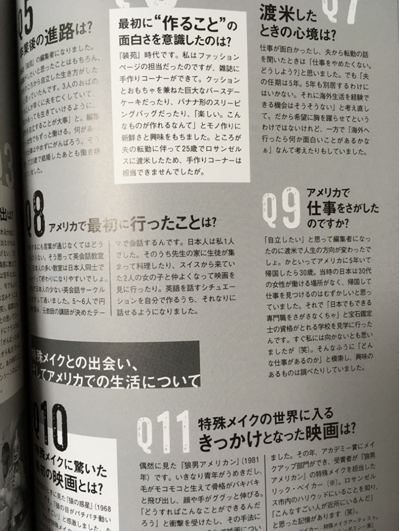 巻末にある江川さんのキャリアの築き方についてのインタビュー記事は、特殊メイク関係なく、女性が一生できる仕事をいかに身に着け、生きていくかに興味のある人なら参考になる内容ではないでしょうか。考えてみれば、旦那さんの転勤のために一緒にアメリカに渡って、そこから英語を勉強して、特殊メイクの学校に通って、飛込営業でハリウッドの映画の現場に携わり、リック・ベイカーと知り合い、その間わずか6年ってムチャクチャ爆速のキャリア形成ですよ。