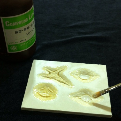 ブースではコスプレ衣装製作の材料として紹介されていましたが、私はアクセサリーにも十分使えると感じました。ウレタン系の二液混合で硬化するタイプの素材なんですが、石膏やシリコンの型、切り出したウレタンシートの上などに「刷毛」で塗って硬化させることができるというもの。型に塗った場合はテスクチャも正確に反映され、切り出したウレタンシートの上では表面の強化・保護もできる。さらに「クリアー」タイプは顔料を混ぜてクリアーカラーにもできるし、硬化後も柔軟性があって黄変しないなどとにかく優れものらしいのです。それに比べてUVレジンよりもグラム単価が安い。最強だろこれ!と思いましたが、素材自体の粘度が高いため、真空脱泡機を使わないと覚範時に混ざった気泡が抜けないのだとか。でも気泡も”味”ということで作品に活かすのもアリなんじゃないでしょうか?
