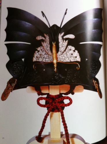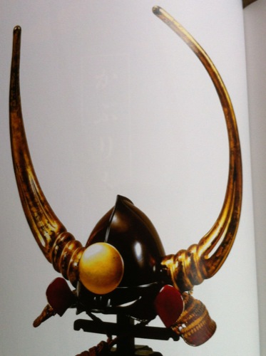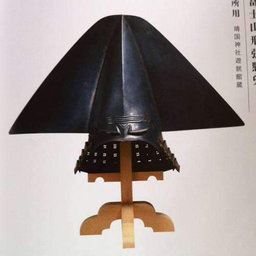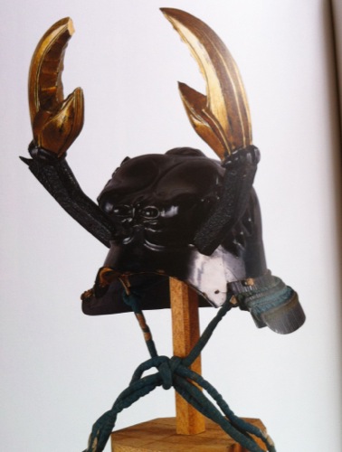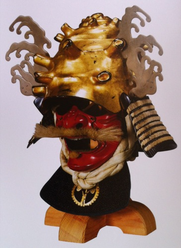 この表紙の写真、面頬じゃなくて兜の前立…というか本体です。この顔がそのまんま兜の前の方に付いてるんですよ。一応仏教モチーフの兜ですね。