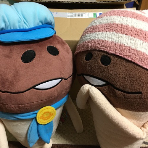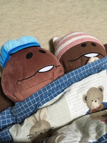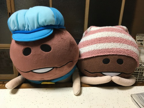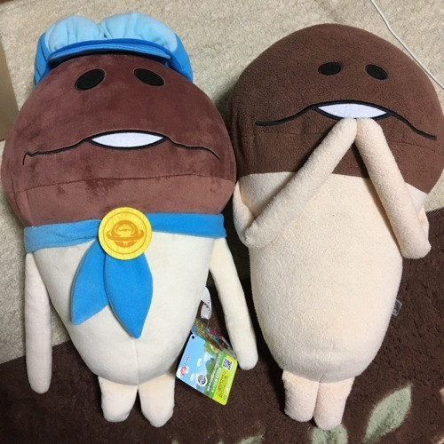 右にいるのは4年前からいる同じサイズ(45cm)の普通なめこのぬいぐるみです。こちらはタオル地なんですが、こうして比較して見ると違いが如実に分かって面白いですね。なめこ君は帽子のボリュームがあるから胴は短めで顔は大きめに作られています。あと口の左端だけうにょうにょしてるのがかわいい!