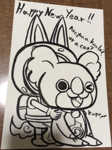で、ここ数年の年明け一発目の創作活動は親戚の子供向けの年賀状描きです。今年はこれ。例年どおり筆ペンにパステルで着色。